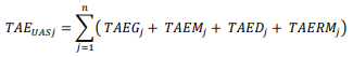Para o cálculo do total de alunos equivalentes da UAS é indicado pela expressão TAEUAS e deve ser definido pelo somatório dos Alunos Equivalentes, por modalidade de ensino, em cada UAS, através da seguinte expressão: